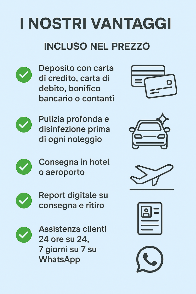 Arrivati all areoporto ad Alghero per un problema con la carta di debito che non era di credito non ci danno la macchina,disperata raggiungiamo casa in pullman.Il giorno dopo mi metto subito a chiamare a raffica i noleggiatori locali,prezzi folli tipo € 100 al giorno e tanti senza macchina,poi finalmente sento loro,spiego la mia situazione al sig Costantino,gli dico che sono disperata,che la nostra casa è in salita,ho una mamma anziana e senza macchina non riesco neanche a fare la spesa,lui gentilissimo,mi dice che al momento non ha disponibilità ma prende a cuore la mia difficoltà e poco dopo mi chiama,prima per avere ben chiaro il periodo e cosa mi serviva, successivamente mi richiama dicendomi che mi ha trovato la macchina.Non mi sembra vero,basta lasciare la cauzione contanti,andare a prendere la macchina domenica mattina a Porto Torres e la nostra vacanza è salva.